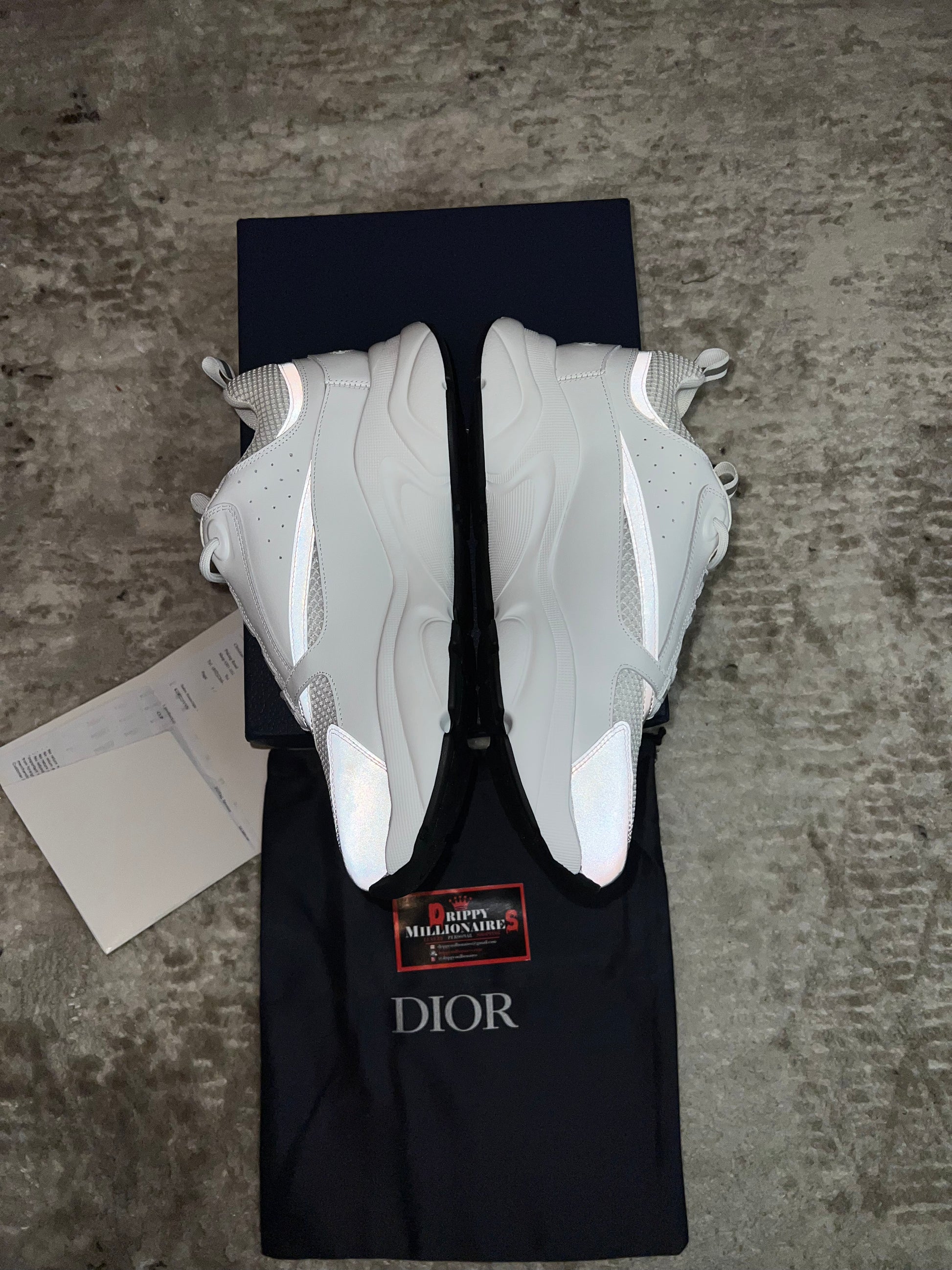 The B22 sneaker reinvents the chunky sneaker through a retro lens. Combining different materials and textures, including white and silver-tone smooth calfskin and white technical mesh, it has a bold, sports-inspired aesthetic. Round laces and a raised 'DIOR' signature on the side complement the thick white sculpted rubber sole. The sneaker can be worn with any casual outfit for a sporty and contemporary silhouette.