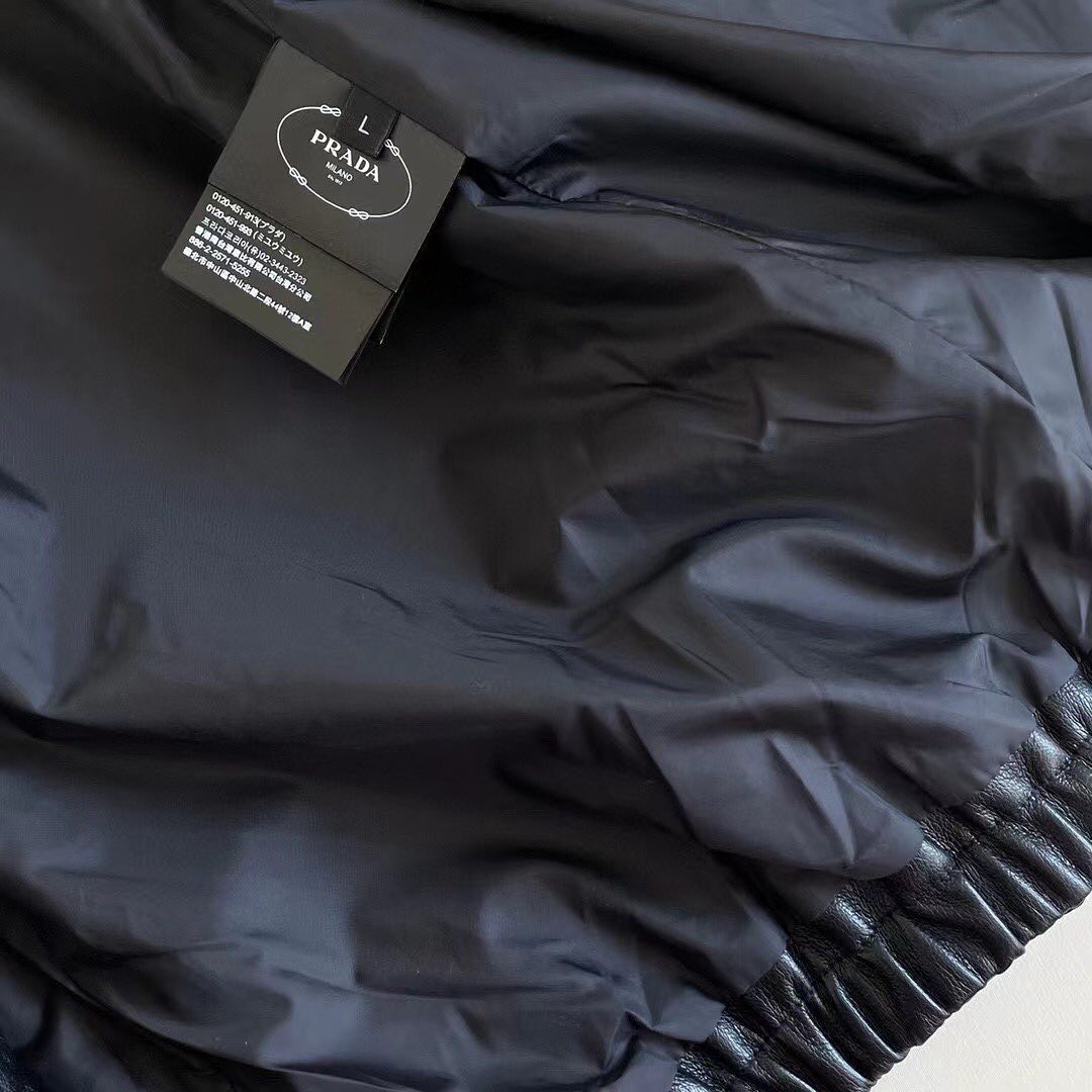 Expertly crafted from premium leather, this black Prada jacket features the iconic Prada logo, embodying the perfect fusion of luxury and style. Exquisite detail and quality make this jacket a statement piece for any wardrobe. Elevate your look with this timeless essential.