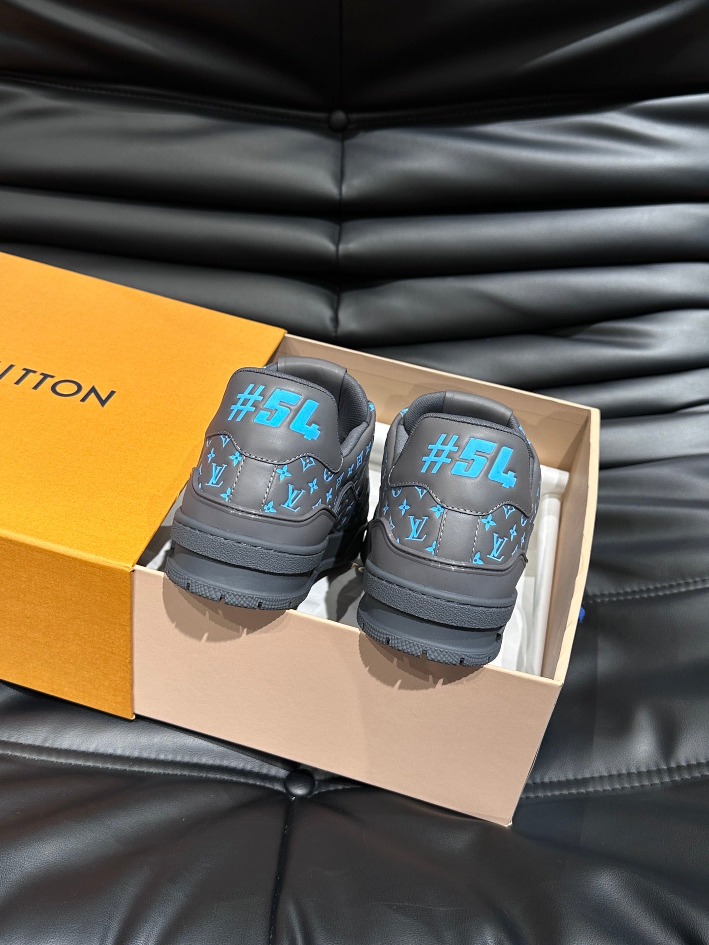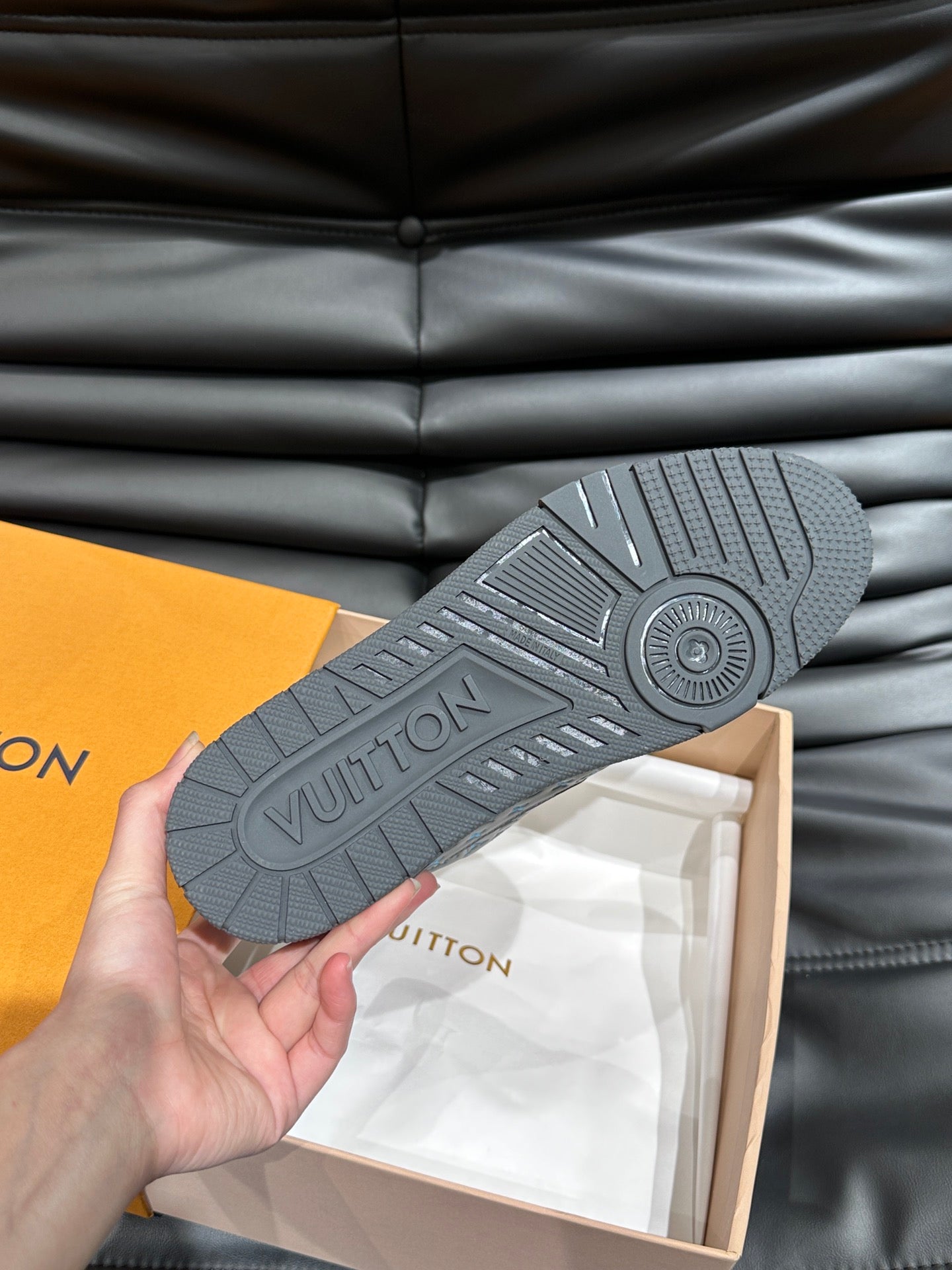 This version of the LV Trainer sneaker is crafted from grained calf leather in a bicolor palette evoking the basketball inspiration of Virgil Abloh's original design. This cult sneaker is notable for its elaborately constructed upper, which takes seven hours to stitch, and for its rich details, including the Louis Vuitton script signature on the side.