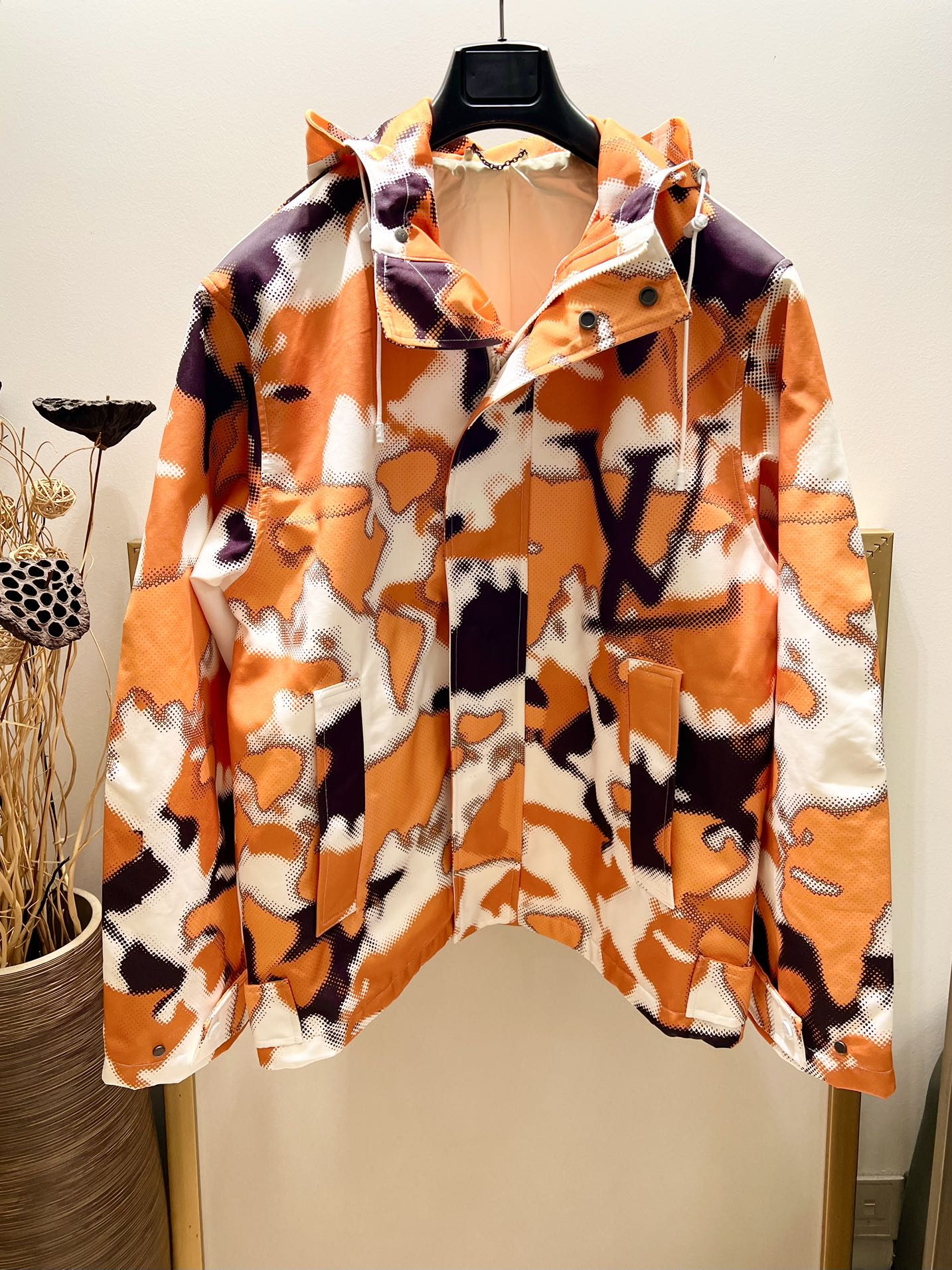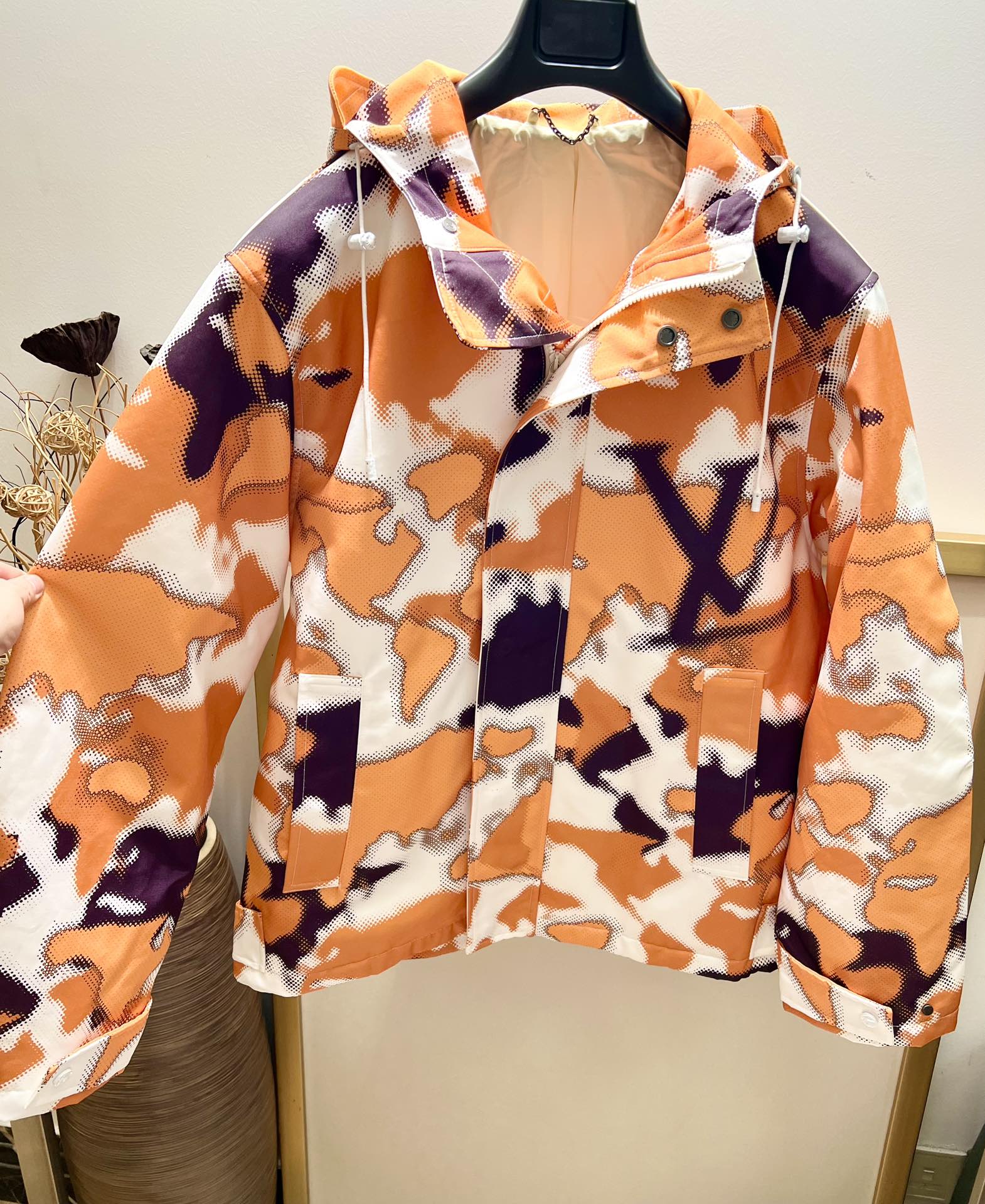 This sporty reversible windbreaker features an allover Monogram motif on one side and plain fabric on the other. It has a hood, a zip closure and elasticated cuffs and bottom hem. It is signed with a tonal LV Staples pin on the chest and a removable Staples tag attached with a tonal carabiner.