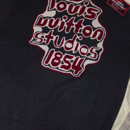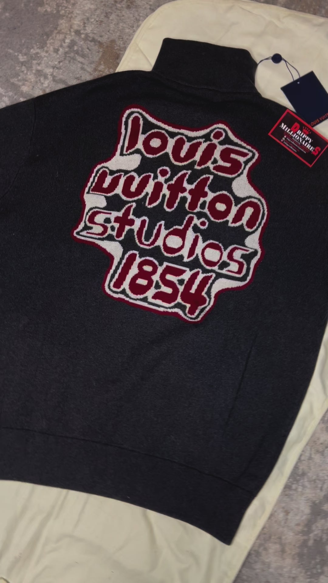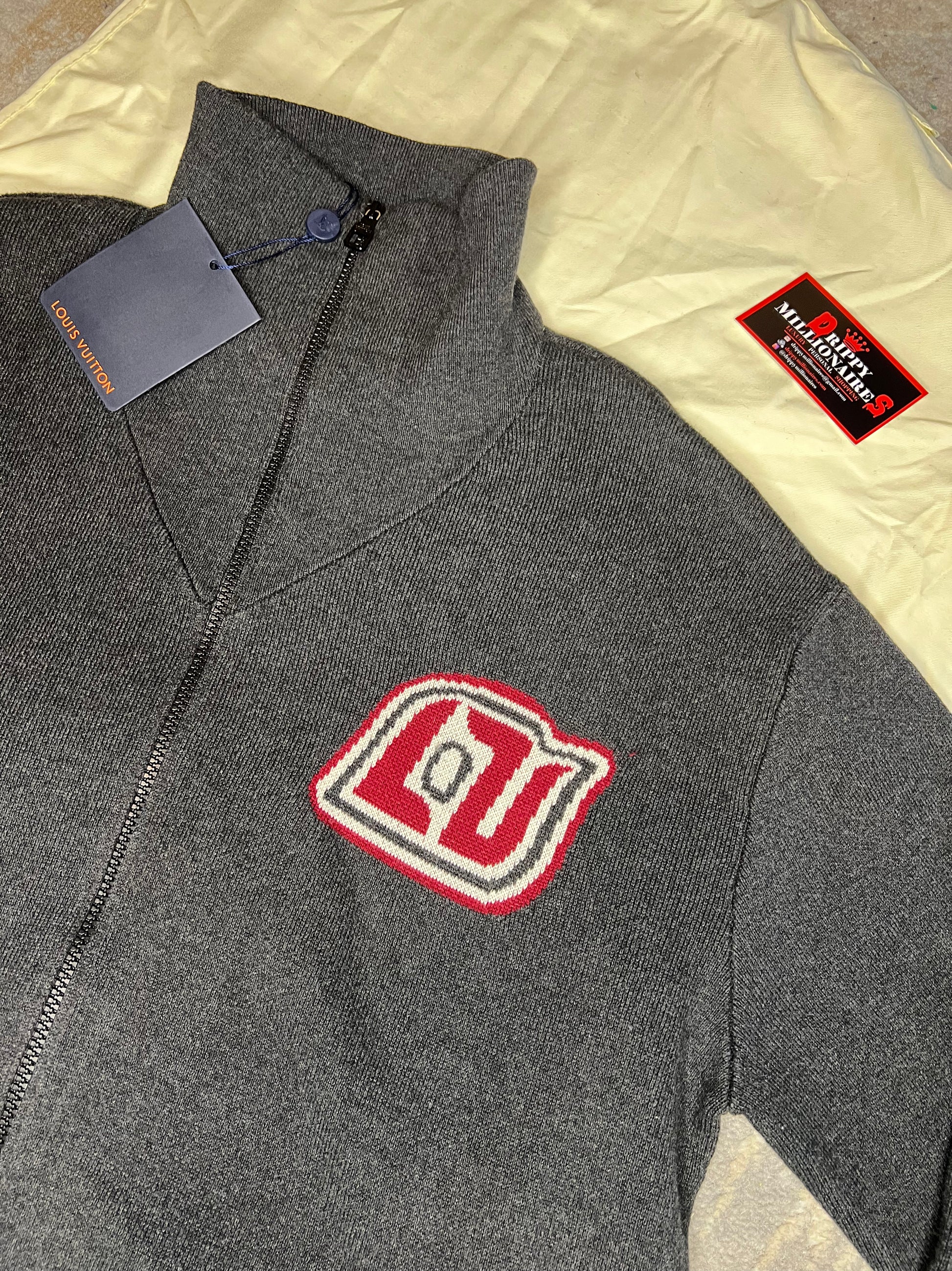This knitted cotton blouson can be worn as an outer layer. Its dark grey silhouette is embellished with jacquard intarsia logos in this collection’s plum tones, with an LV on the chest and a Louis Vuitton Studios signature on the back. This casual and relaxed piece pairs effortlessly with everyday looks.