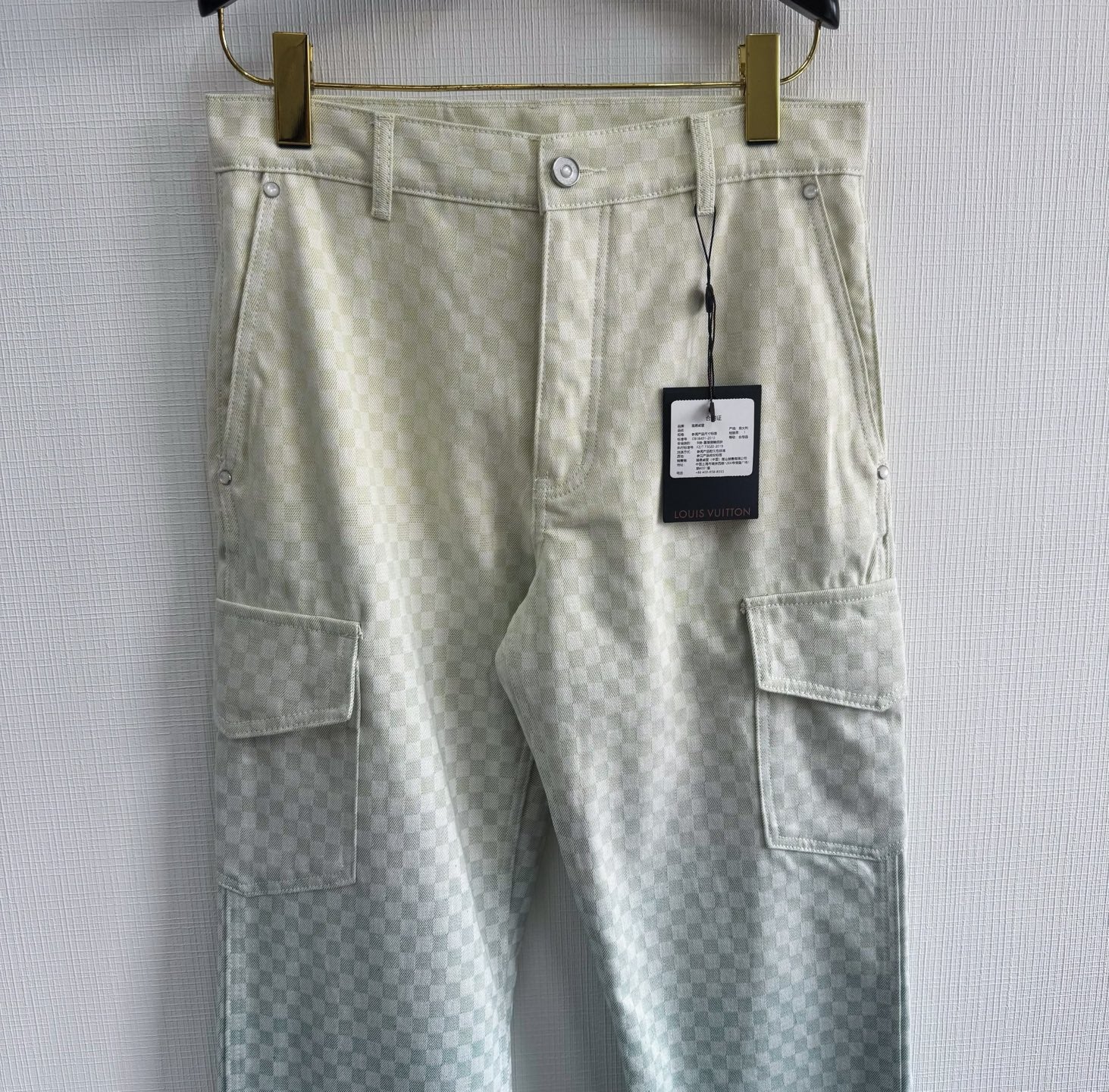These denim workwear pants are crafted from cotton canvas in a versatile tan color that makes them easy to mix and match with everyday looks. Embroidered LV letters on the back right pocket and a Damier nubuck jacqueron add a smart signature touch to this versatile design, which makes a contemporary set paired with a matching jacket.