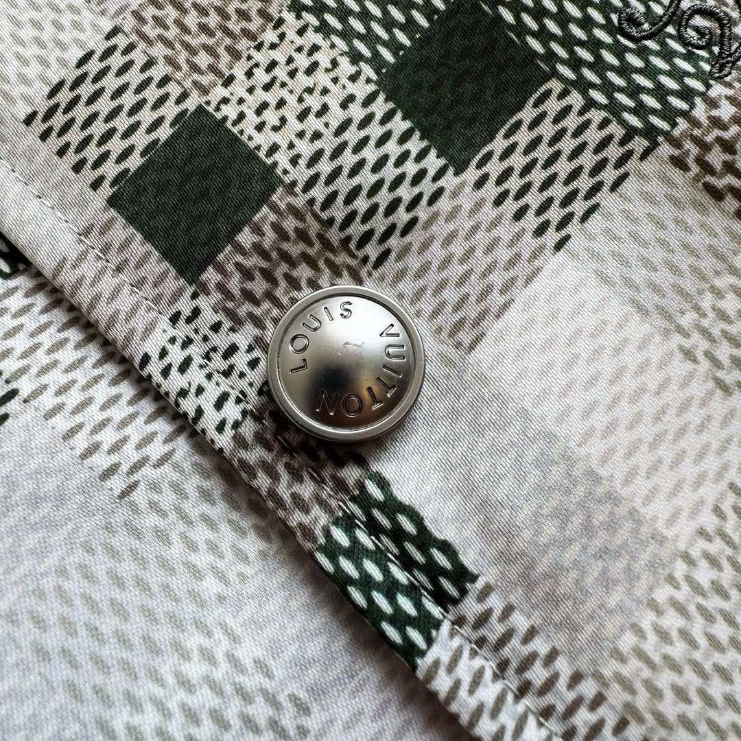 This coach jacket elegantly twists a sporty silhouette with its fluid satin construction and graphic Snakoflage print that revisits the iconic Damier in pixelated pale khaki and beige tones that call to mind the markings on snakeskin. An embroidered Louis Vuitton signature adorns the chest, while piped details on the sleeves and pockets add a chic finishing touch.
