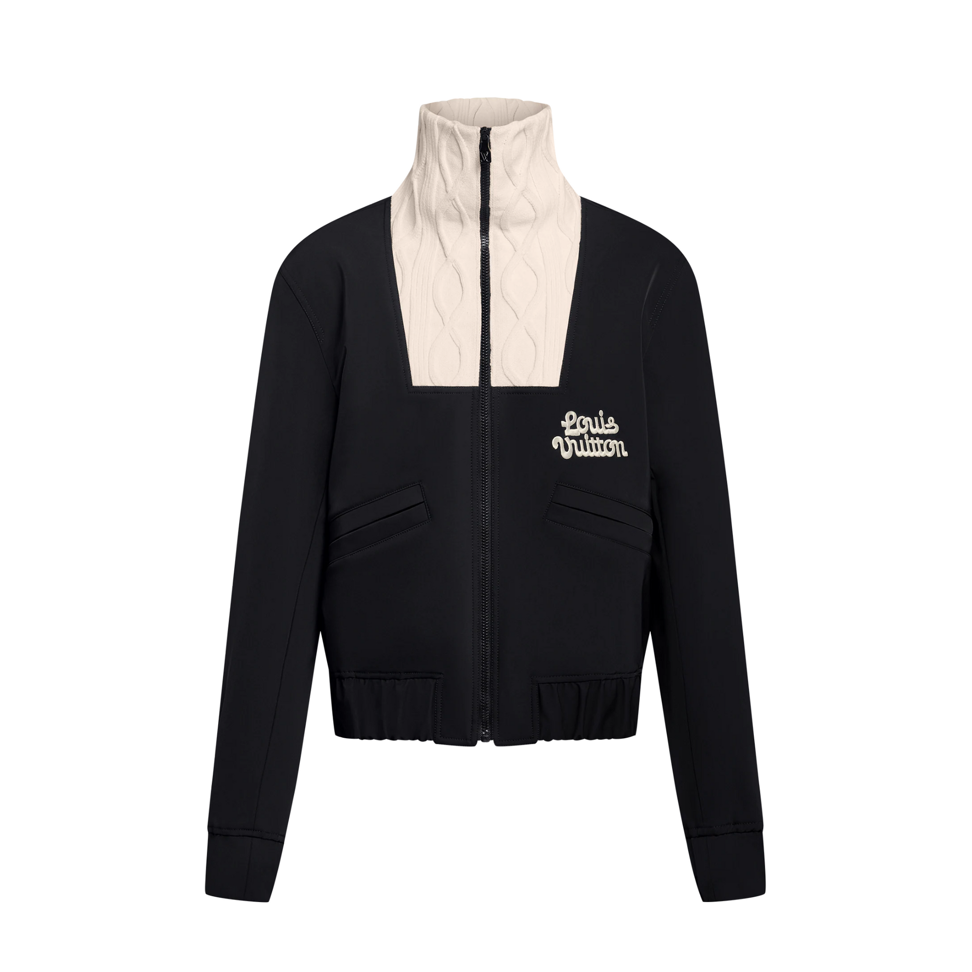 This elegant hybrid blouson charts fresh territory, elevating a sporty silhouette with the House’s savoir-faire. Crafted from a smart black nylon twill, it is embellished with contrasting white accents that include an embroidered Louis Vuitton on the chest, a large embroidered Blooming LV signature across the back and a tall cable-knit collar. This distinctive piece has matching track pants for a chic yet relaxed look.
