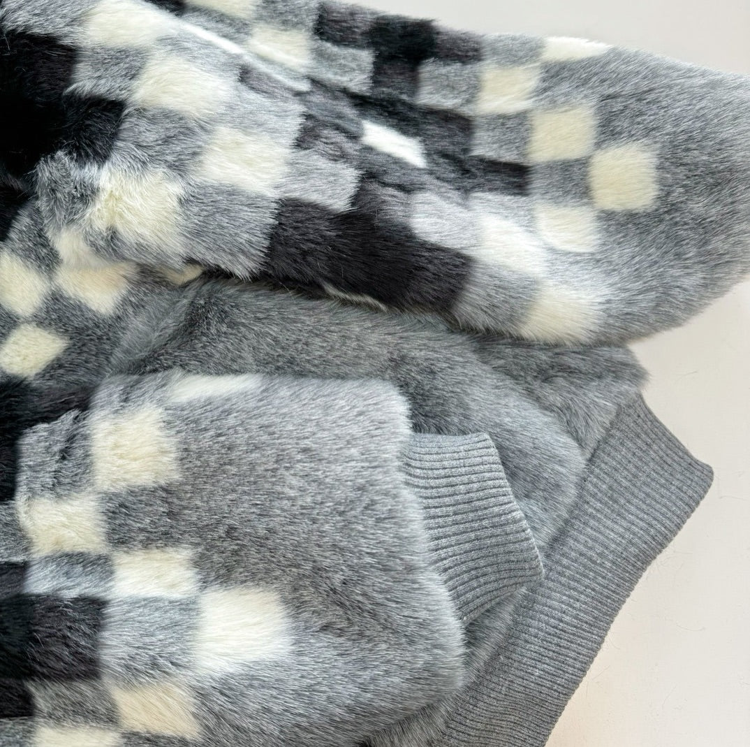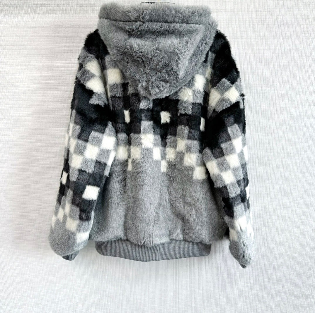Meticulously crafted in sumptuous mink, this exclusive hooded blouson features a Fair Isle-inspired inlaid motif that plays on the Damier and Monogram Flower signatures. The deep fur is trimmed in places creating a 3D effect that sets off the wintery motif, while a contrasting LV adorns the left pocket. A cozy yet sophisticated piece for chic après-ski moments.