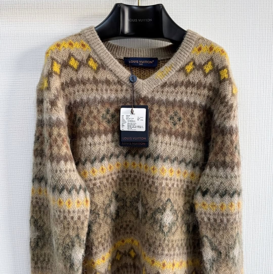 This fluffy mohair and wool-blend pullover draws on British sartorial tradition with a reworked LV Fair Isle jacquard in elegant brown tones. Discreet House signatures are incorporated into the heritage motif, while an embroidered Louis Vuitton adorns the ribbed v-neck. This cozy design, inspired by this collection’s Westminster dog walkers, is perfect for a wintery stroll.