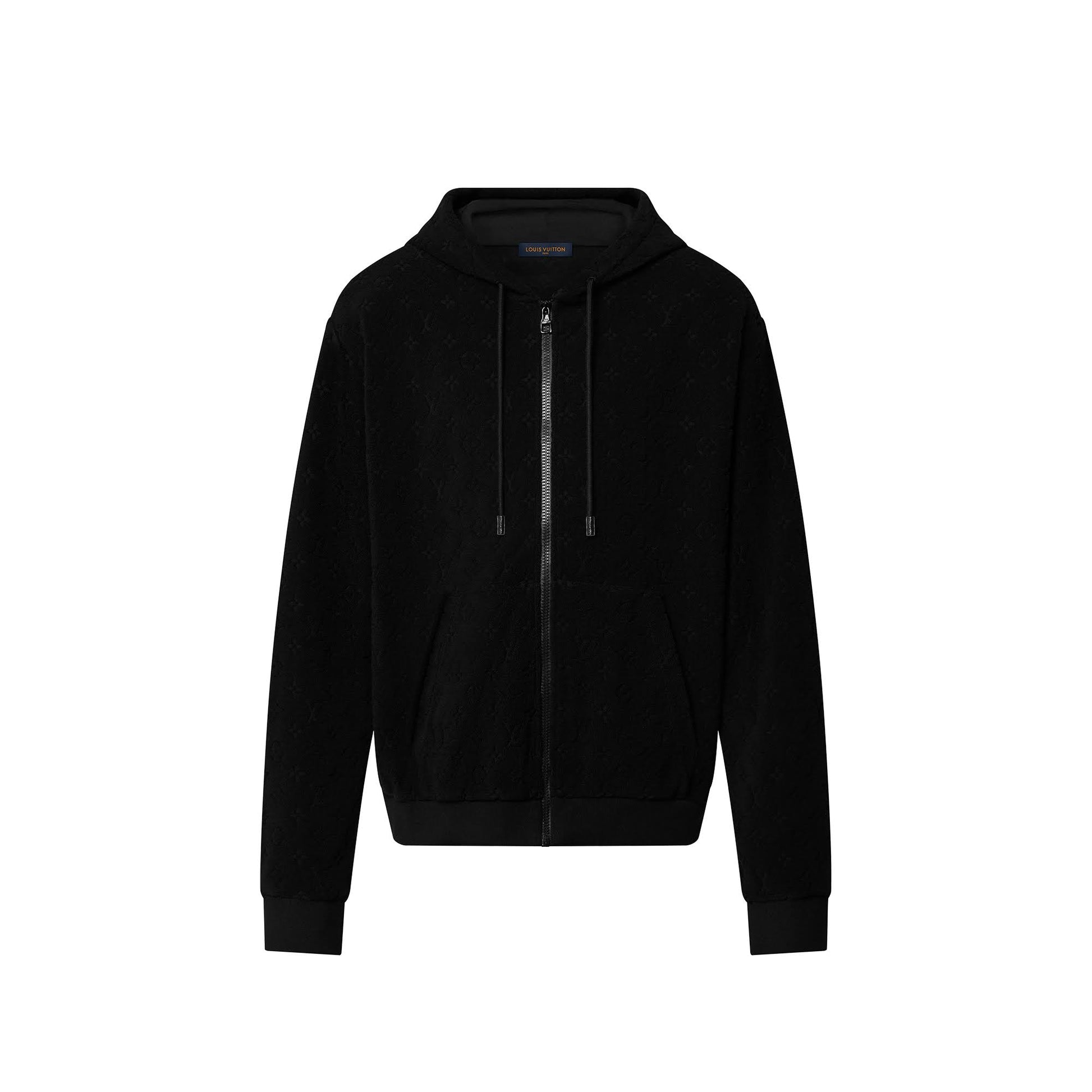This black zip-through hoodie made from soft French terry is both comfortable and refined, making it ideal for relaxing after the beach. The spongy cotton-blend fabric is distinguished with an allover debossed tonal Monogram signature. This piece can be worn as a set with matching shorts.