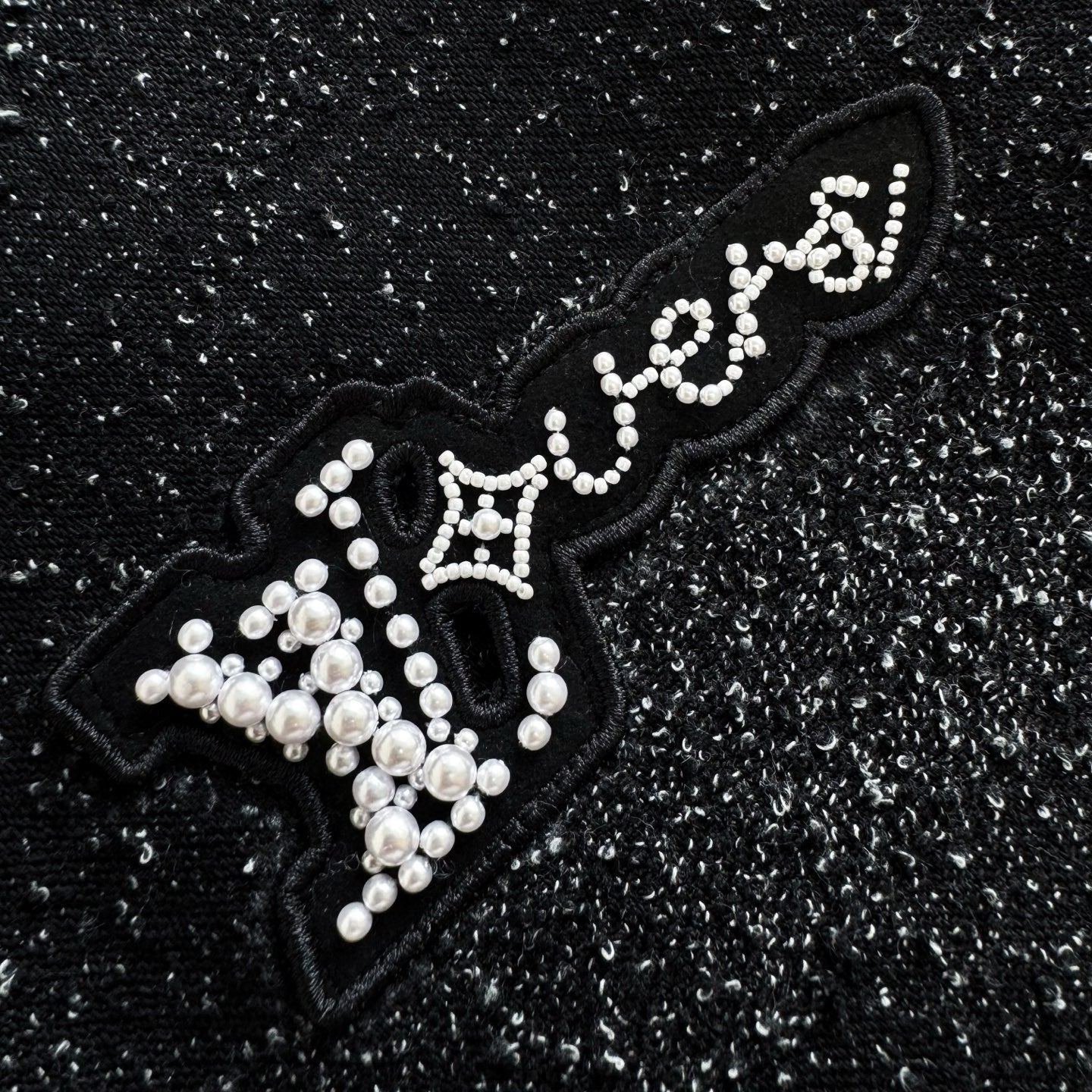 This sophisticated take on the varsity blouson features the Spring-Summer 2025 show’s tonal black Damoflage woven into a bouclette body. Rhinestone and resin-pearl encrusted signature patches and pearl-effect buttons adorn this piece with lustrous accents, while black nubuck leather sleeves and pockets add a softly textured, sober accent to this meticulously crafted silhouette.