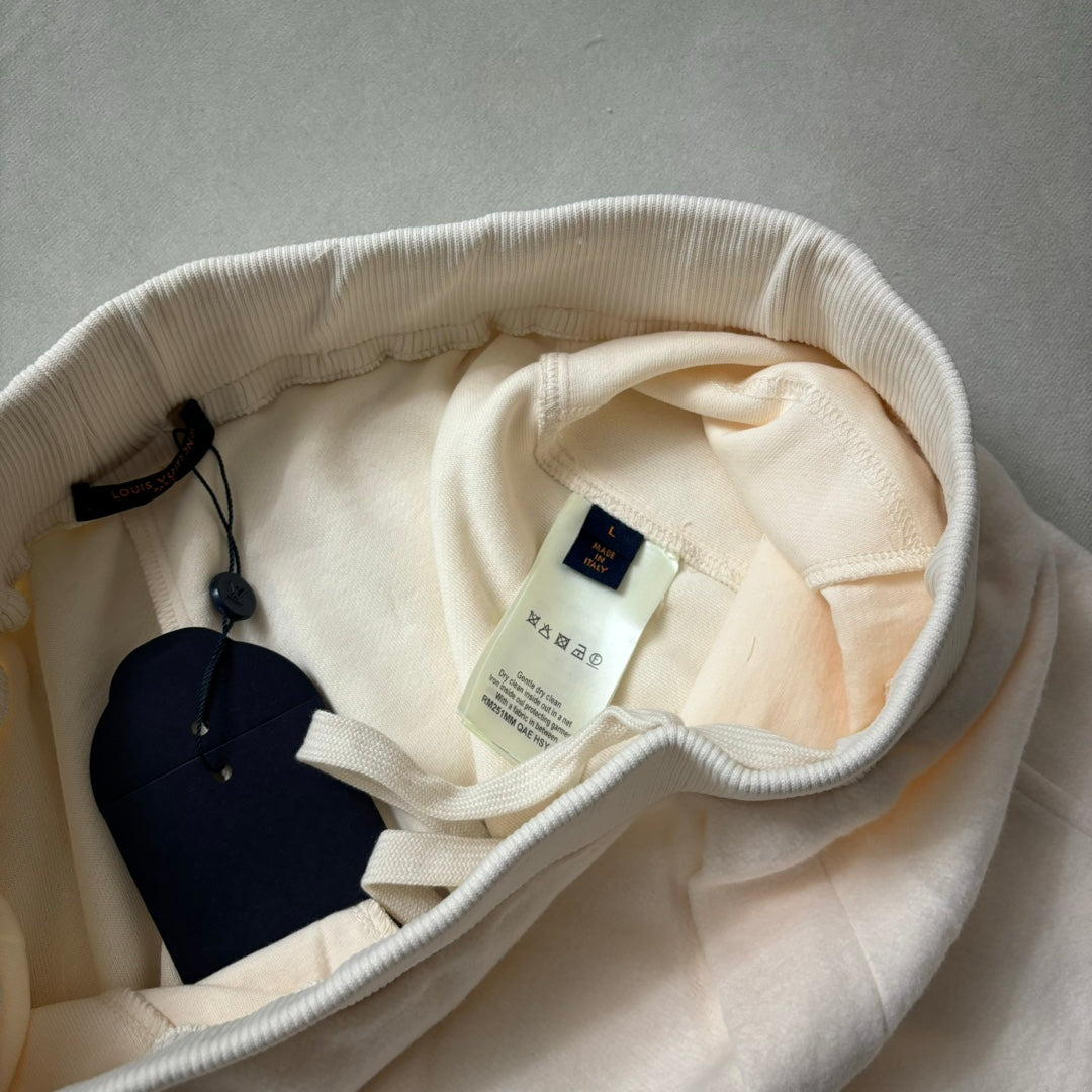 Casual yet elegant, this loungewear-inspired pants is perfect for traveling, crafted from warm, softly textured wool fleece in timeless cream tones. The sporty tailoring features a tall, drawstring-adjusted collar and raglan sleeves with ribbed elbows for ease of movement. Topstitching creates a smart, quilted effect with an embroidered LV on the chest. Matching pants make a cosy set. - Relaxed Fit - LV embroidery on the chest - Sporty quilted details on the sleeves and chest - Ribbed cuffs and bottom hem - Raglan sleeves - Kangaroo pockets - Milky White - 100% Wool - Made in Italy