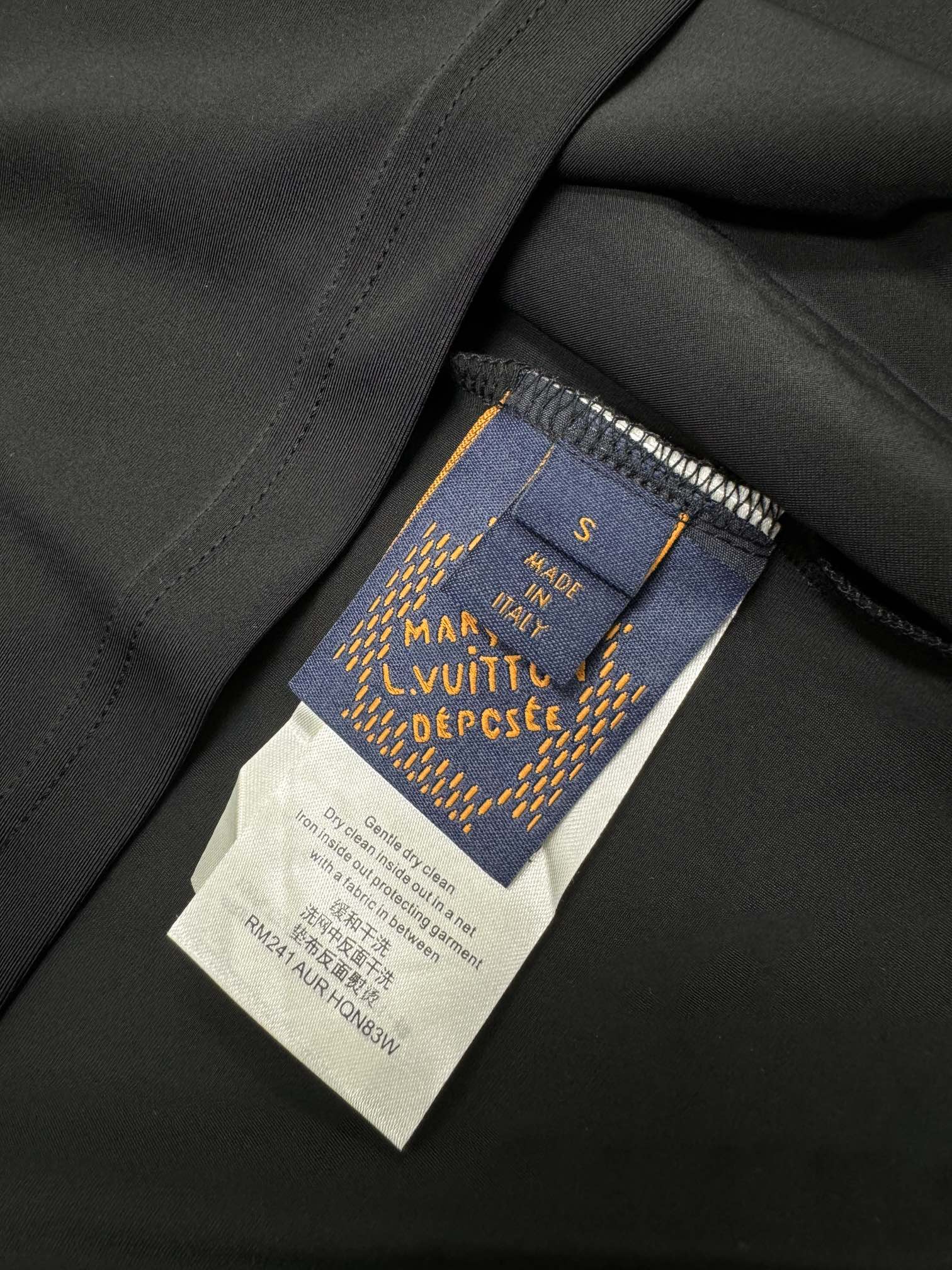 Expertly crafted and designed, this Louis Vuitton t-shirt features a sleek black design with contrasting white text. Made with the finest materials, this t-shirt exudes luxury and sophistication. Perfect for adding a touch of elegance to any wardrobe.