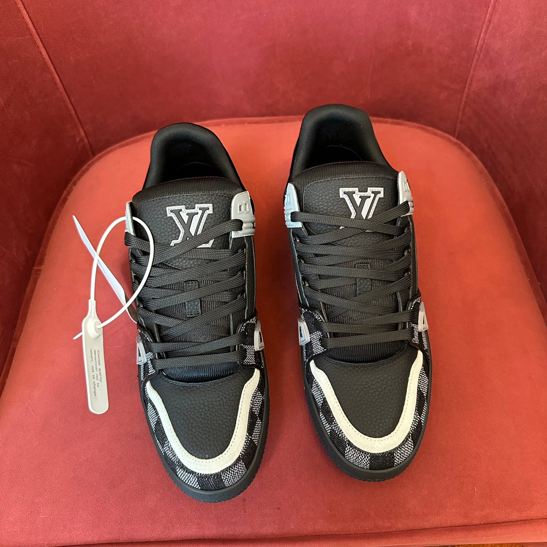 This version of the LV Trainer sneaker is crafted from grained calf leather in a bicolor palette evoking the basketball inspiration of Virgil Abloh's original design. This cult sneaker is notable for its elaborately constructed upper, which takes seven hours to stitch, and for its rich details, including the Louis Vuitton script signature on the side.