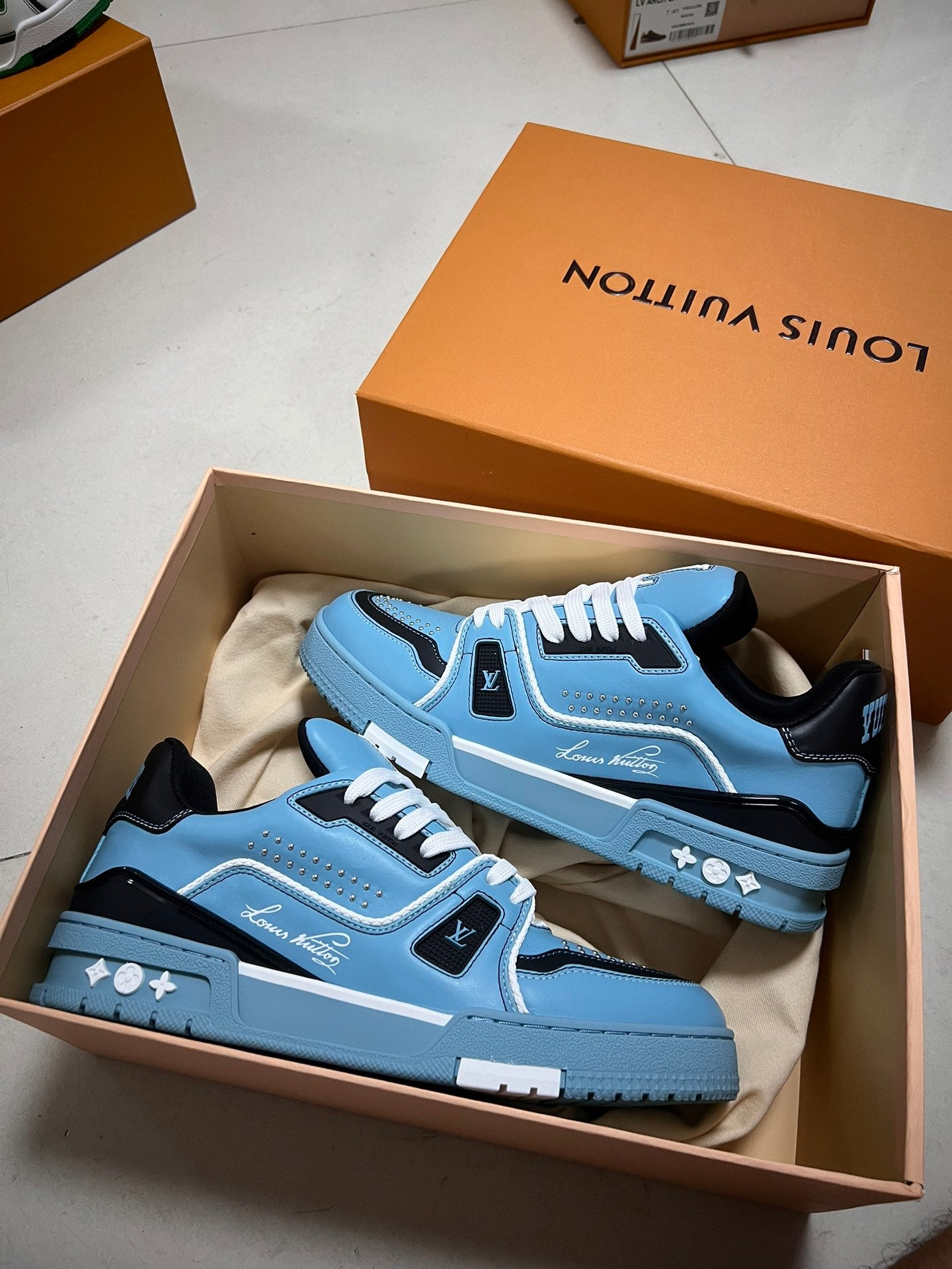 This version of the LV Trainer sneaker is crafted from grained calf leather in a bicolor palette evoking the basketball inspiration of Virgil Abloh's original design. This cult sneaker is notable for its elaborately constructed upper, which takes seven hours to stitch, and for its rich details, including the Louis Vuitton script signature on the side.