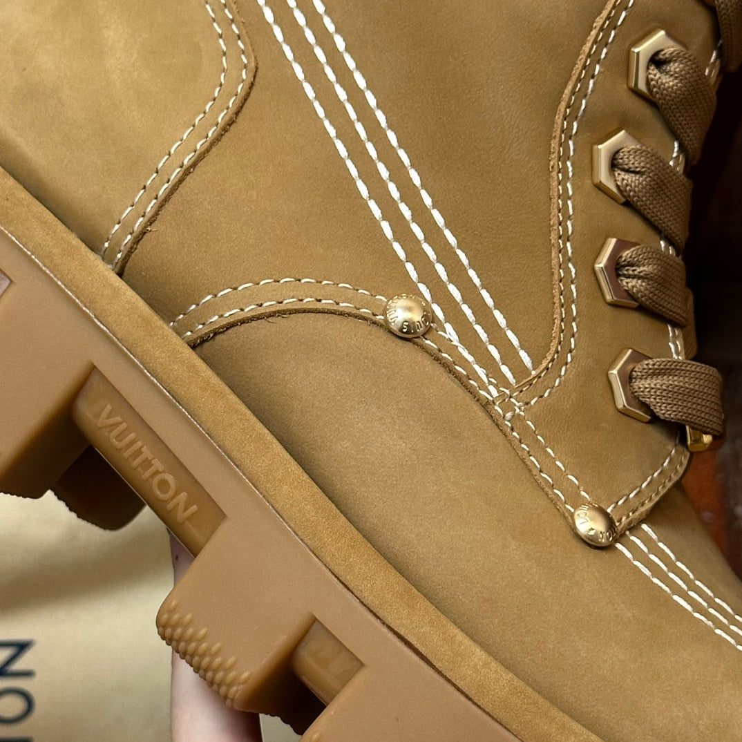 The LV Checker ankle boot in nubuck calf leather is a hybrid style first seen at Louis Vuitton's Spring-Summer 2024 men's show. The upper is embellished with engraved metal studs and a Vuitton lace accessory. The rubber outsole, which is chunky yet lightweight, was inspired by utility shoes and features the Damier pattern on the tread.