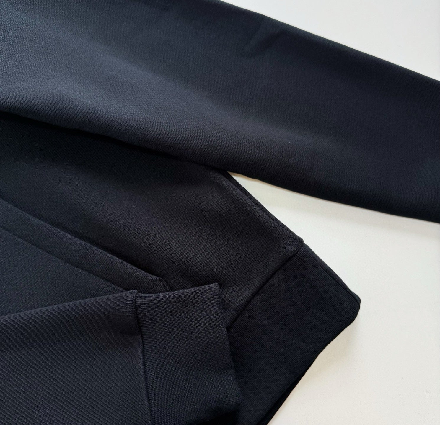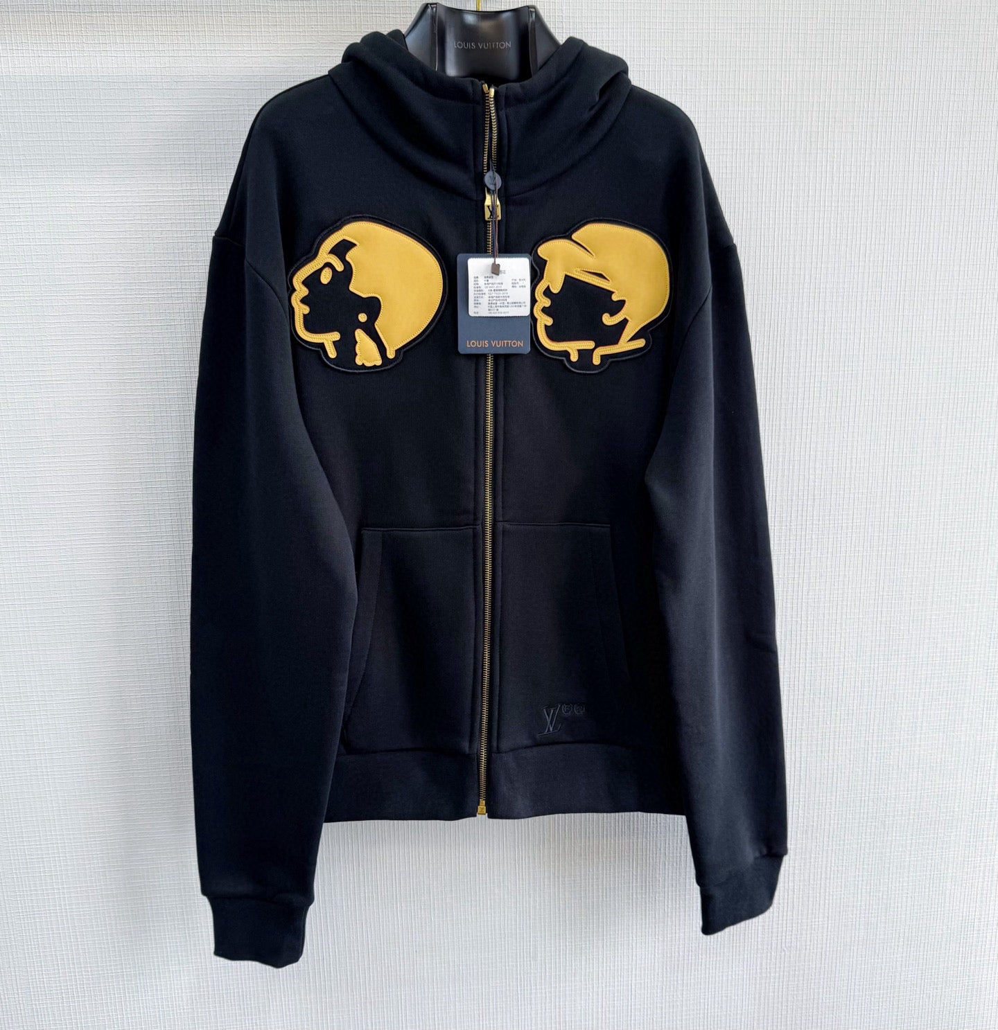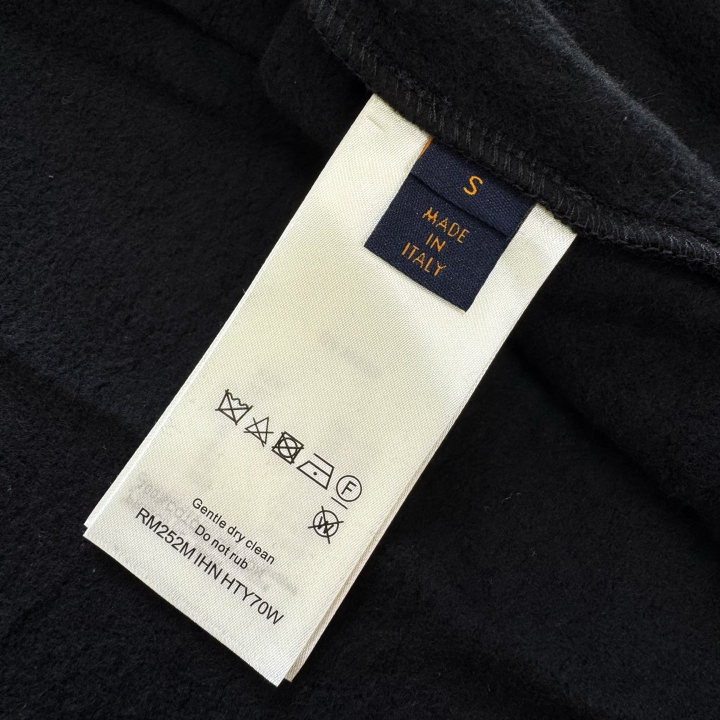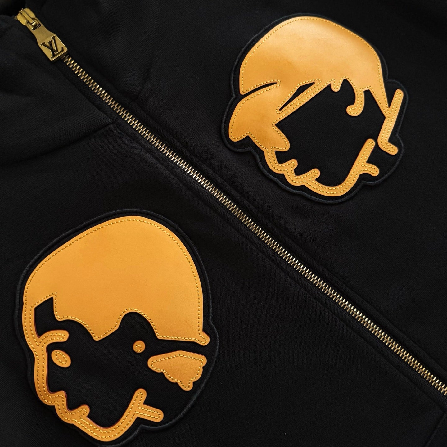 This smart black cotton hoodie is inspired by the Fall-Winter 2025 show’s collaboration between Pharrell and Nigo, whose longstanding friendship is represented in two embroidered portrait patches in the House’s emblematic VVN leather on the chest and an embroidered LV PN signature on the left pocket. The tall collar can be zipped up into the hood to create a balaclava.