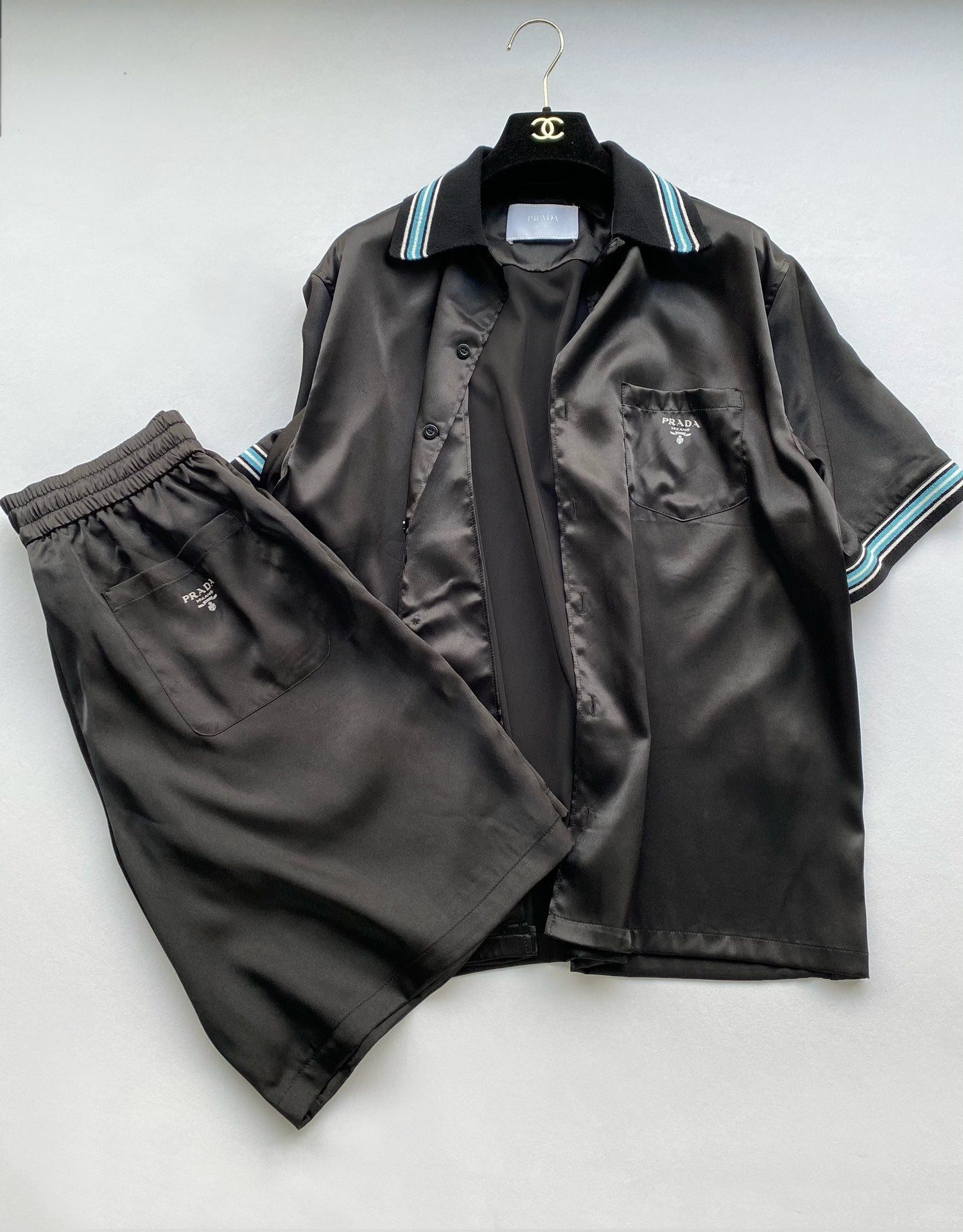 Upgrade your wardrobe with the elegant Prada Silk Shirt and Shorts Set. Made with luxurious silk fabric, this set features a sophisticated silk shirt and comfortable shorts. Perfect for any occasion, this set will elevate your style and provide the utmost comfort.