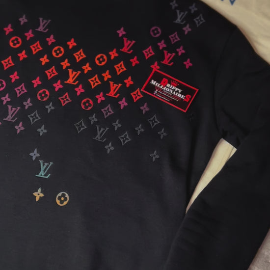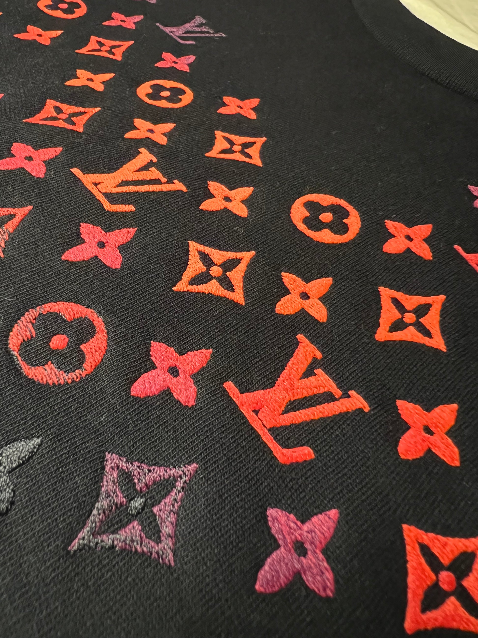 This smart black sweatshirt in compact cotton jersey is inspired by the dreamlike shifting colors of the aurora borealis of this collection. The relaxed silhouette is embellished with a scattered embroidered Monogram across the front and back in luminescent jewel tones, giving a festive winter mood. This piece brings an elevated twist to a casual silhouette.