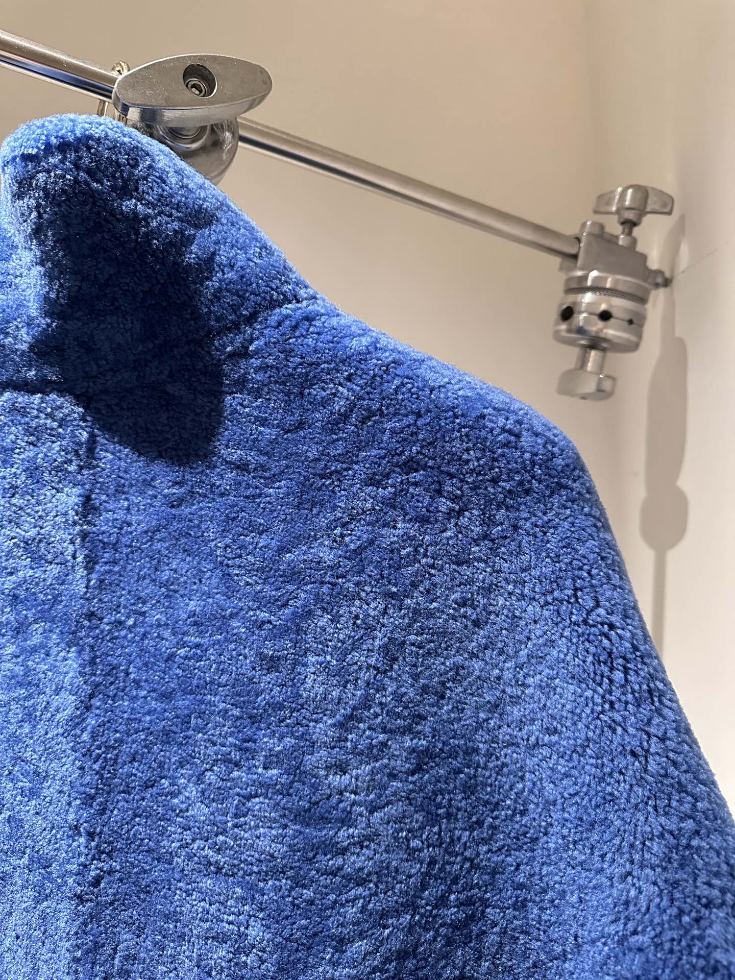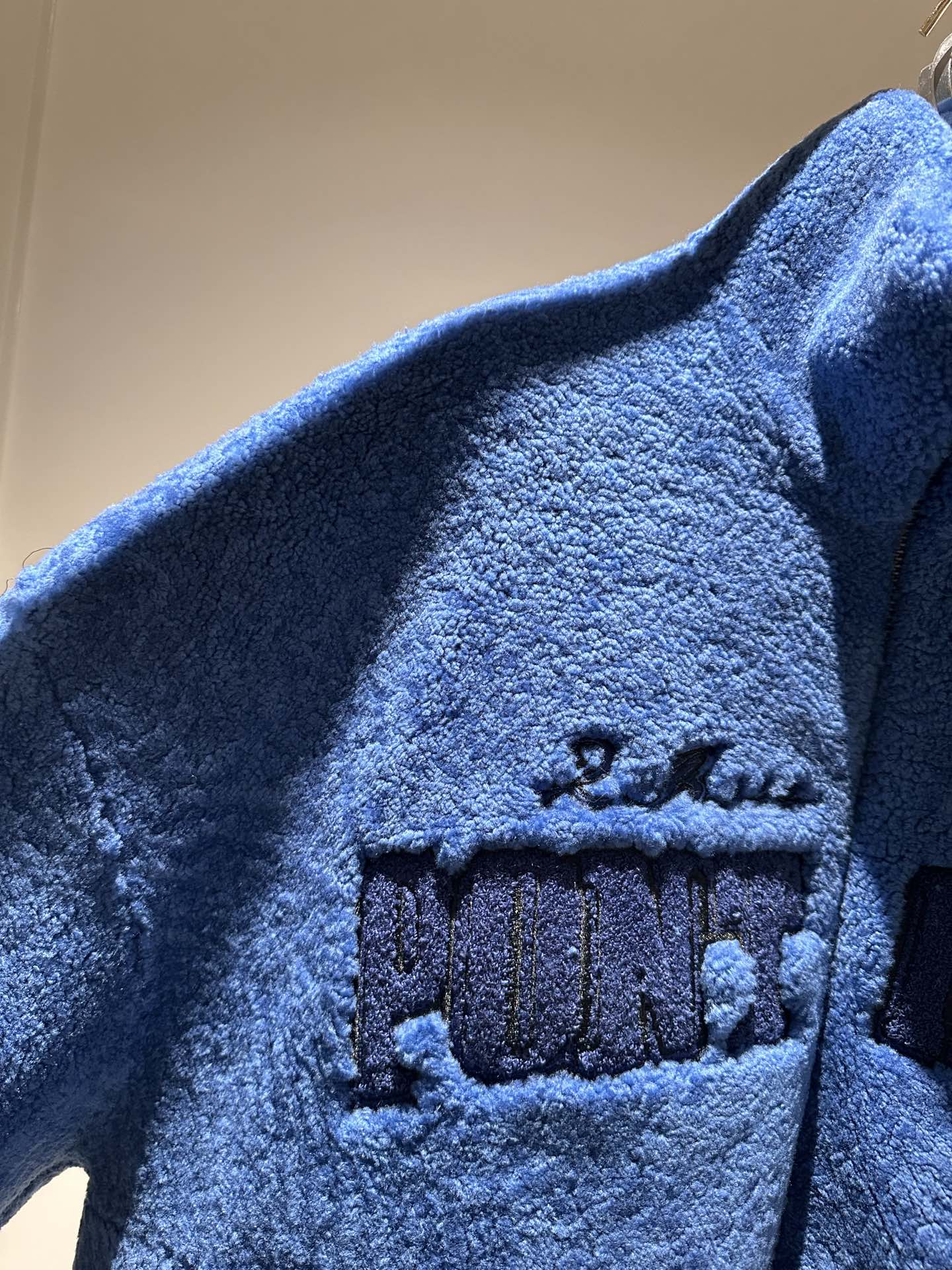 This exclusive vibrant blue shearling blouson has a relaxed tracksuit top silhouette with a varsity-inspired embroidered Pont Neuf signature across the chest. The soft wool is clipped, creating a lustrous finish, while a tall fur collar protects against the cold. This bold design brings a contemporary twist to everyday looks.